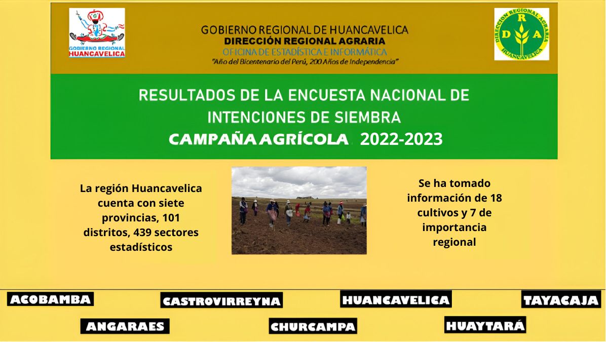 La actividad agrícola tiene un rol preponderante en la formación de la producción agropecuaria y constituye la base del suministro y aprovisionamiento de alimentos para satisfacer la demanda internay externa de principales productos agrícolas. La base de datos de la estadística agraria regional parte de la recolección mediante el método de Estimación, a través de informantes calificados, el cual consiste en evaluar las variables que intervienen en el proceso de producción de los cultivos investigados en un periodo dado en el sector estadístico. Para la estimación, el técnico estadístico recorre mensualmente el ámbito que tenga bajo responsabilidad, a fin de realizar la estimación y evaluación objetiva de las variables productivas de los cultivos ubicados en cada uno de los sectores estadísticos.